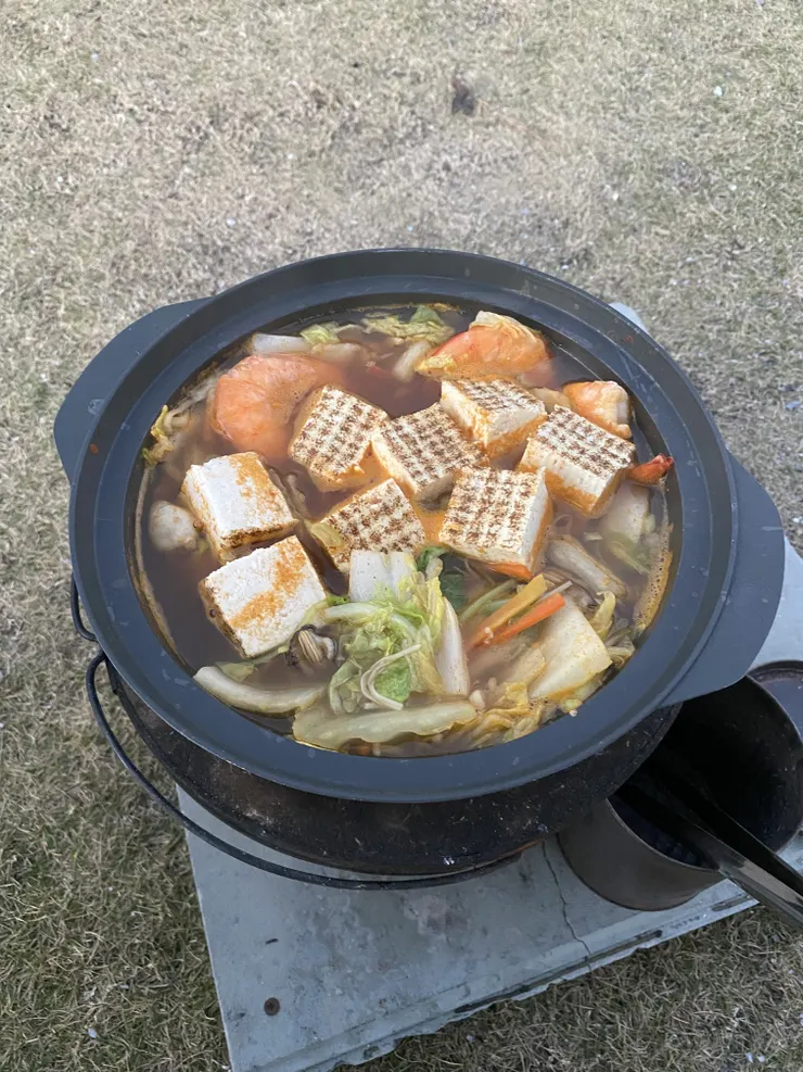 キャンプ場チェックインからの日帰り入浴で、サウナ三昧からの青空ビール。夕食豆腐でスンドゥブチゲ。シメは辛ラーメン、残ったスープで、翌日雑炊。