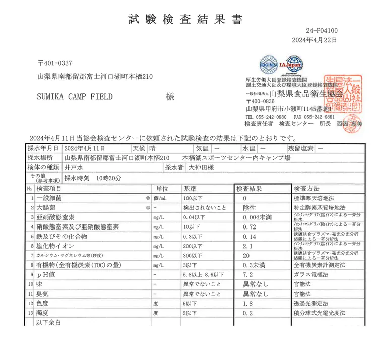今年も、水質検査の結果が返ってきました。