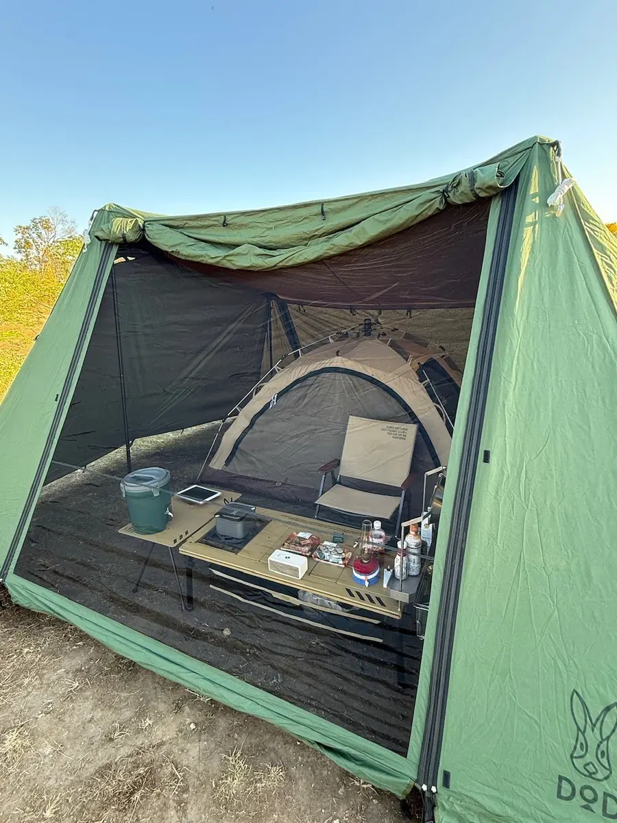 以前のキャンプで隣のサイトの方がTPUドアを取り付けたテントで薪ストーブを楽しんでいた風景が忘れられずにいるとのこと。