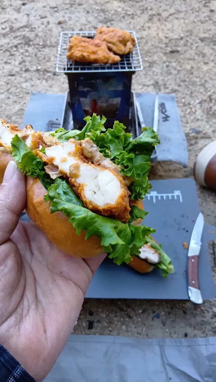 チキンを炙りながらパンに切り込みを入れ、ソースを塗ってレタスを挟んで……何やらすごい煙が。