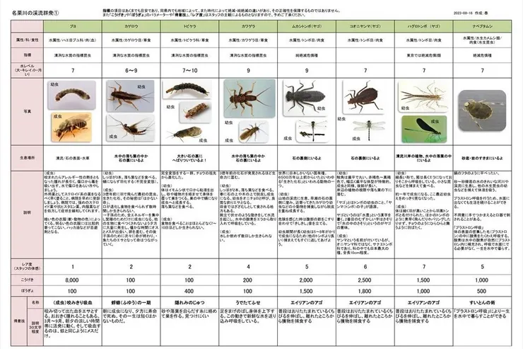 この一覧をもとに、場内を流れる名栗川で生き物を探し、親子で観察をしてみてはいかがでしょうか