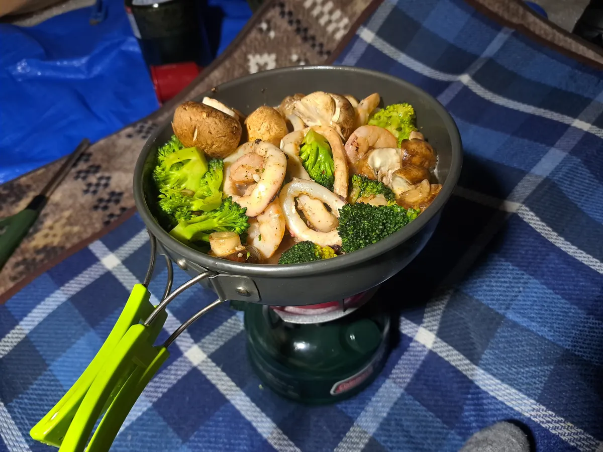 本日のメニューはシーフードミックスにブロッコリーとマッシュルームを加えたアヒージョ。