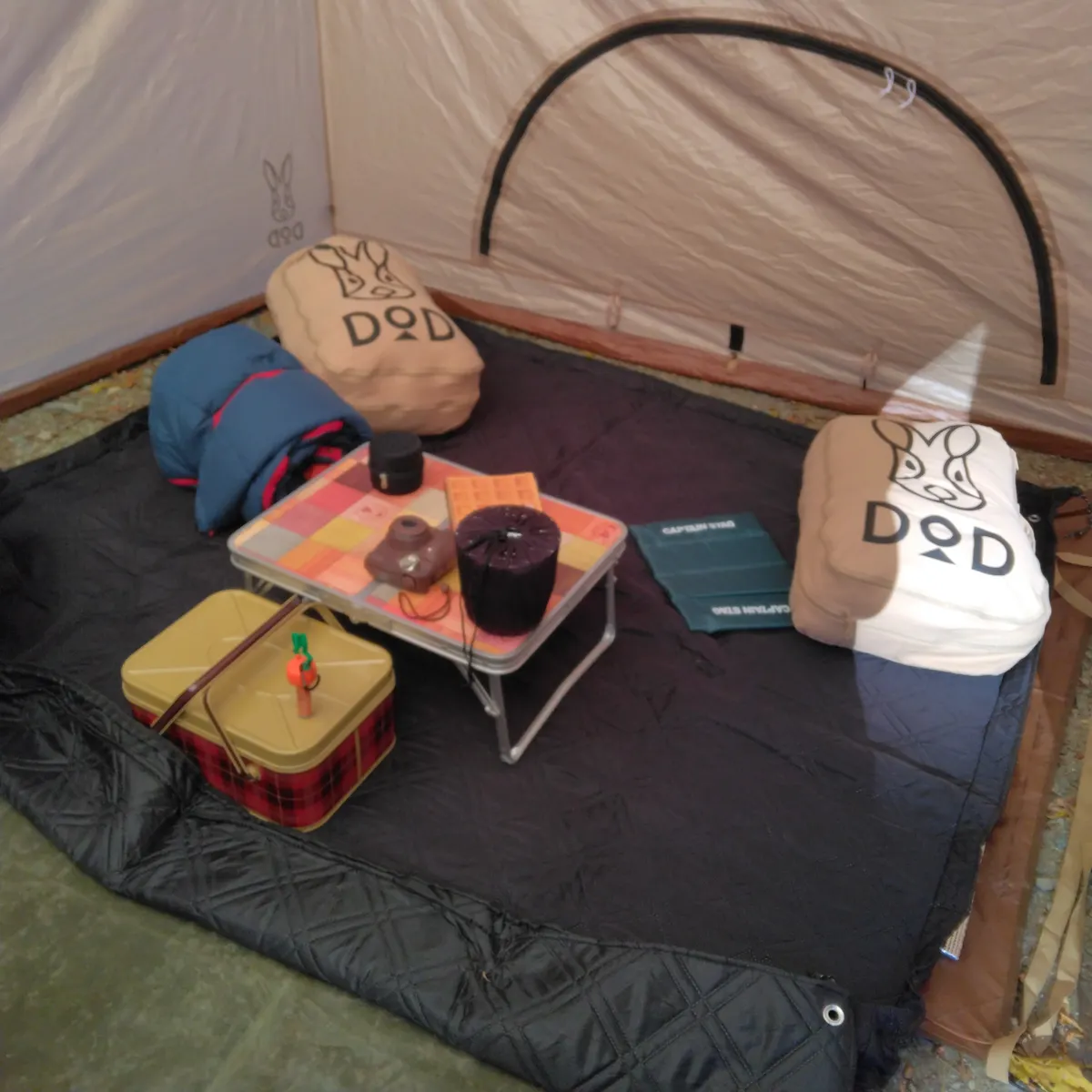 コット無しは久々で、お籠もりスタイルに。グランドシート、断熱シート、撥水バスタブ型シートに寝袋クッションというざっくり座敷。