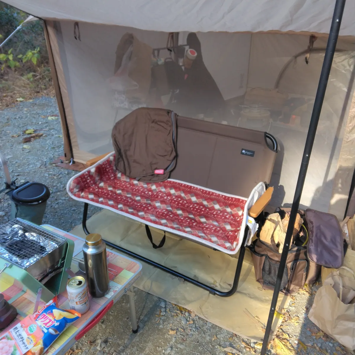 ロゴスのベンチタイプチェア! 座面広々、二人で座ってブランケットかければ暖か…とお気に入りに♪かわいい柄のシートはニトリのあったかパッドです。