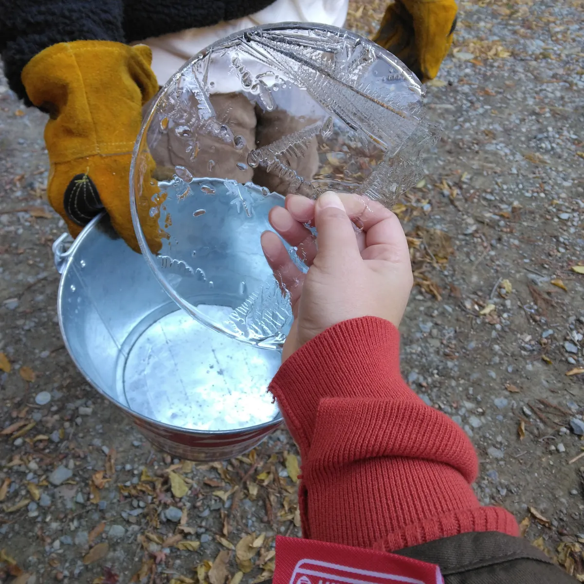焚き火用に水張ってたバケツには氷が!でも、シュラフの中はほかほか暖かでした。