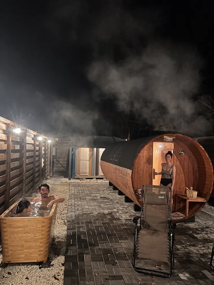 フィールド内には、カフェ「鹿のねどこ」、バレルサウナ「鹿のスウェット」、キャビン3棟「いの」「しか」「ちょう」がございます。シャワートイレ棟はいつもきれいに保たれており、棟内は空調も完備!していますので、暑さ寒さでトイレ時間が不快。。というお悩みからもサヨウナラ。炊事場もいつもきれいでお湯も出ます。洗剤とスポンジも常備しています!