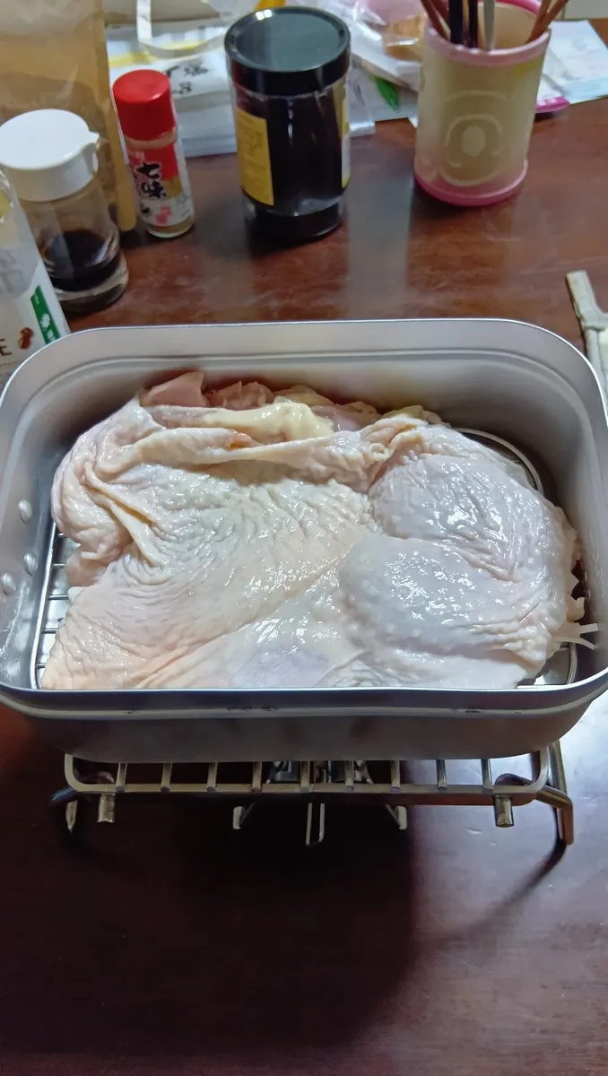 鶏もも肉の下拵えは、臭み消し程度に少量の酒と塩で漬けただけです。