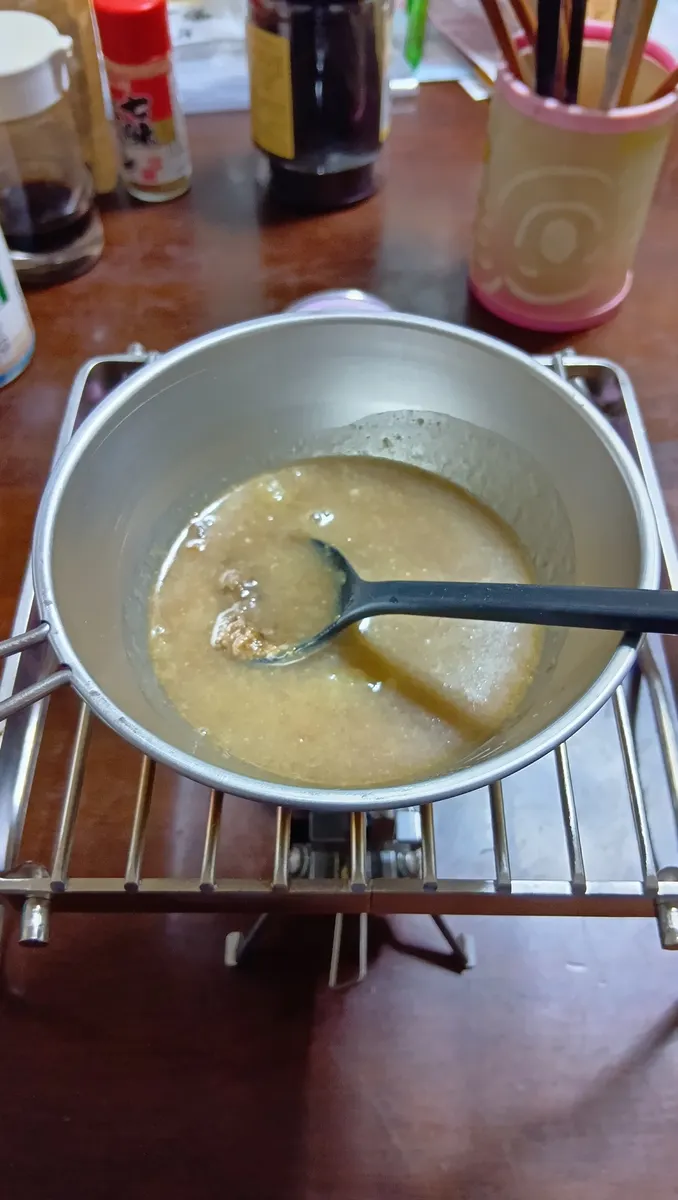 砂糖が溶けたら沸騰前に火からおろして、醤油と花椒辣醤を追加。