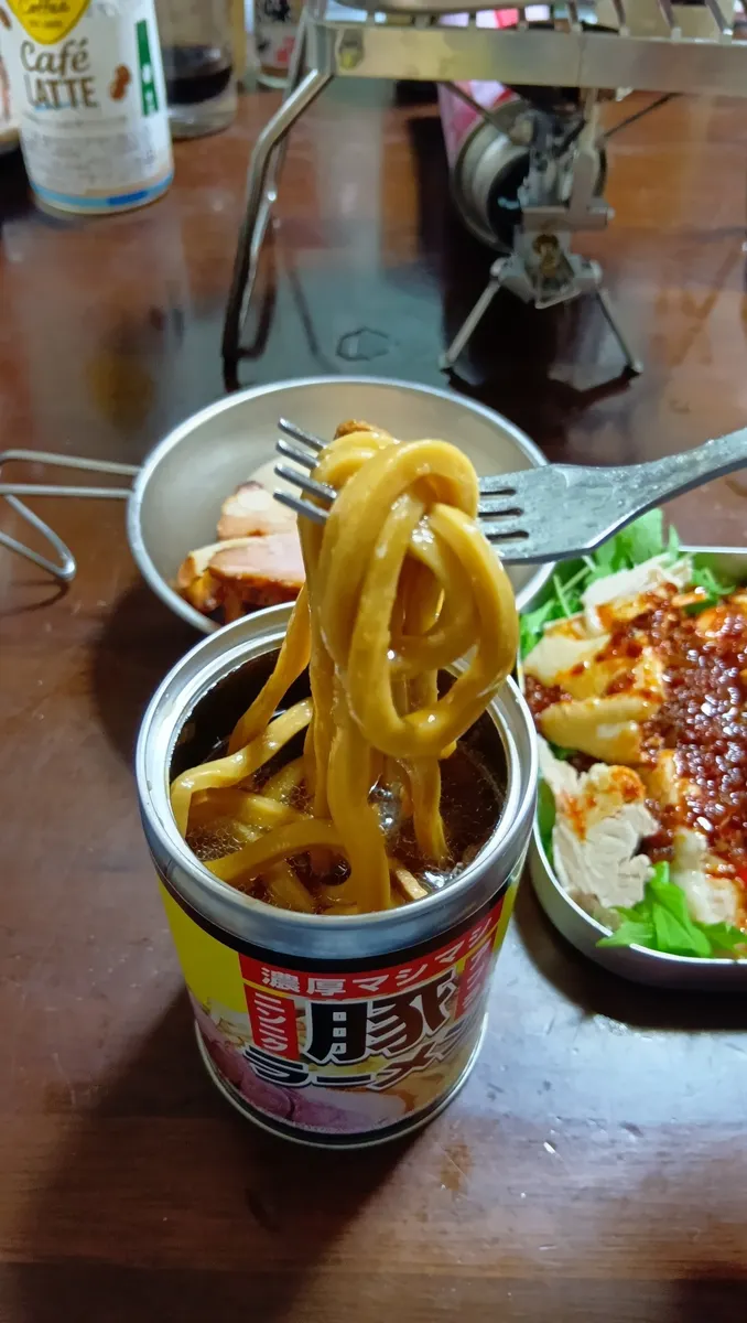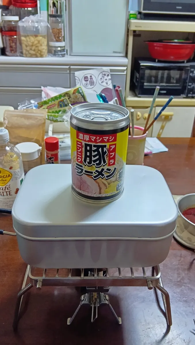 蒸しているメスティンの上で、缶ラーメンも温めておきましょう。