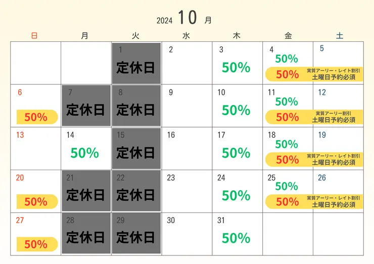 ・【黄色背景】土曜日を含む連泊 →金曜日または日曜日、もしくは両方が記載の割引率でご利用可能