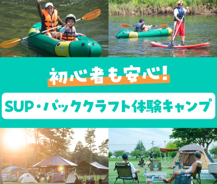 キャンプ場から車で約5分、太平洋を望む木戸川河口で楽しむSUP・パックラフト体験が付いたプランです。
