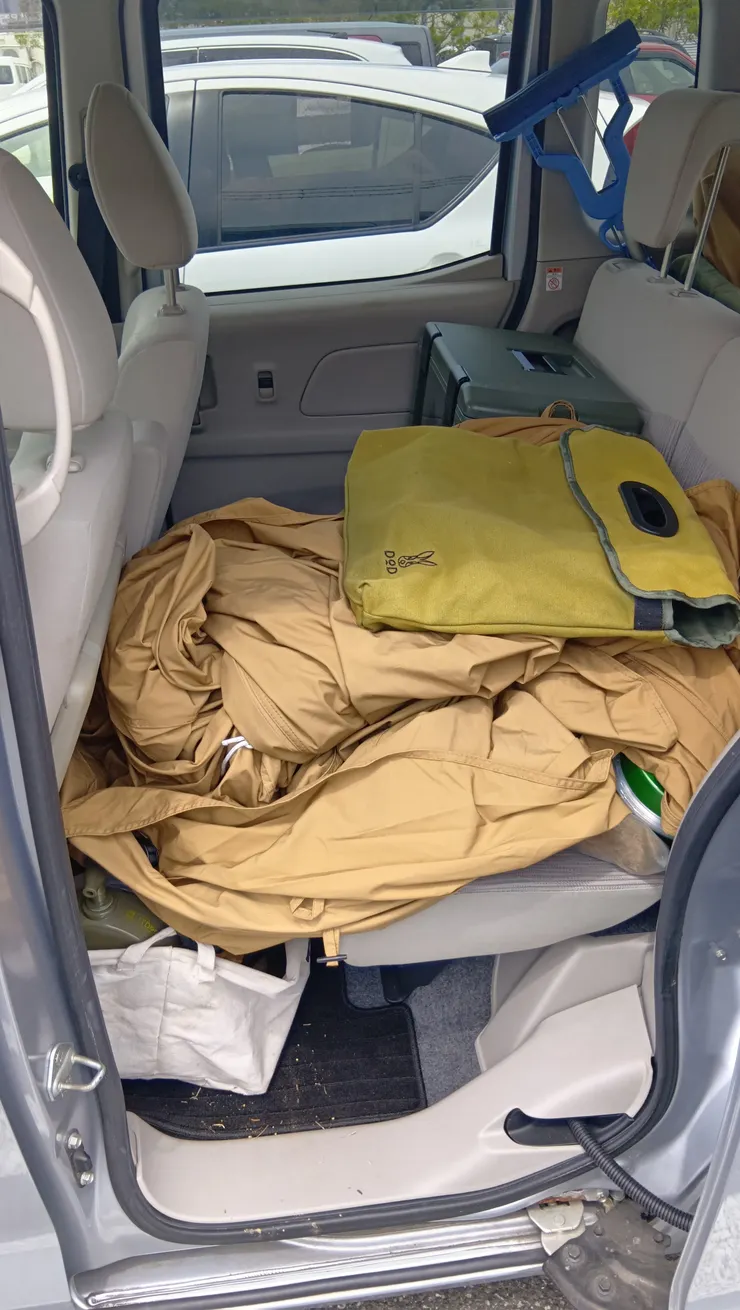 テントをたたむ時間もないから、とりあえず丸めて車に押し込めっ!