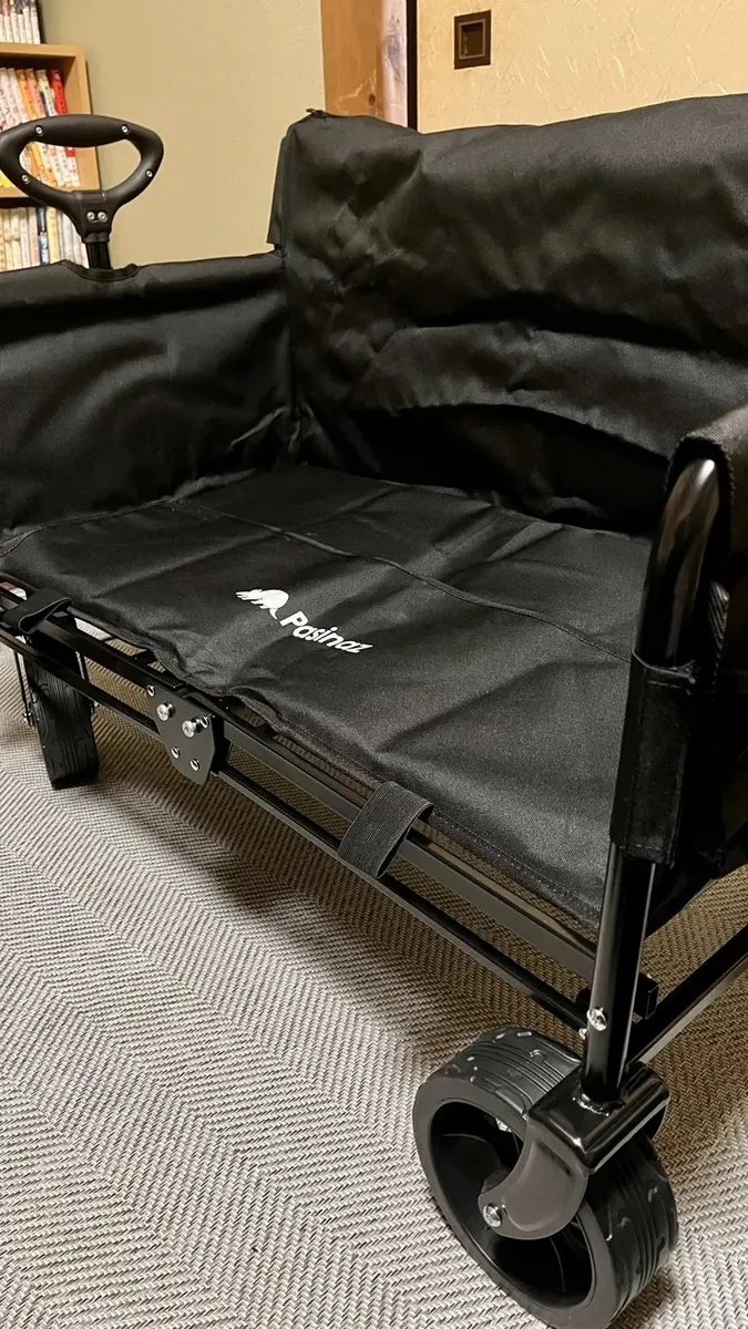 座れるキャリーワゴンを購入されて、まずは自宅で使用されているとか。家の中でもアウトドアを感じられてオシャレ♪自宅用で購入もありですね!