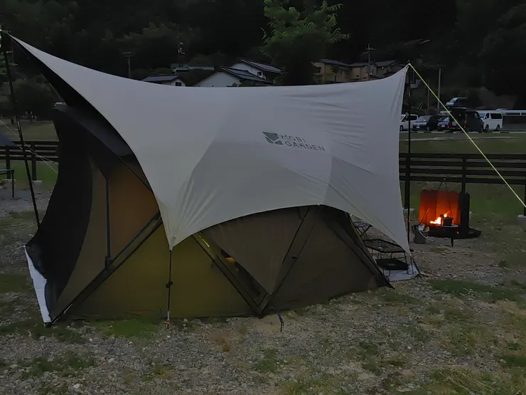 自分では設営も撤収も楽でこういう最終形態になりましたが、なんといっても雨降りの撤収時、タープの中で作業ができるのが◎
