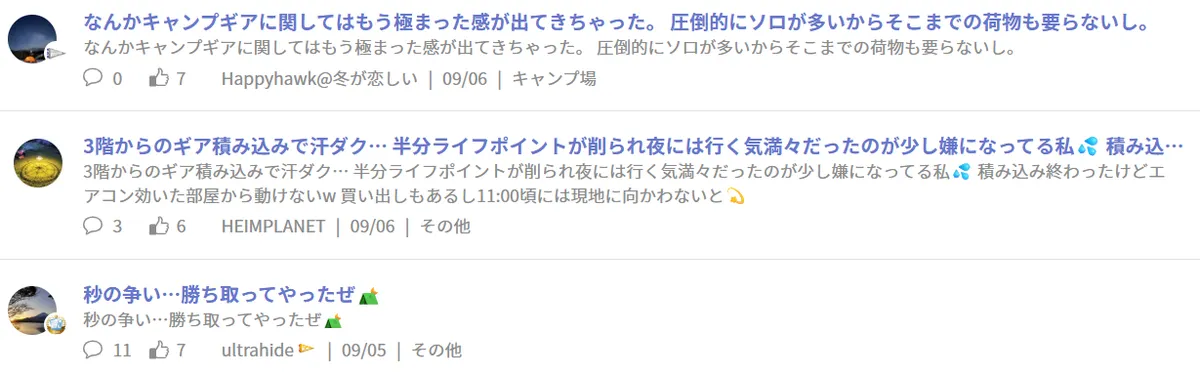 今日キャンプに行ったこと、気になっているギアのことなど、気軽につぶやいてみよう!