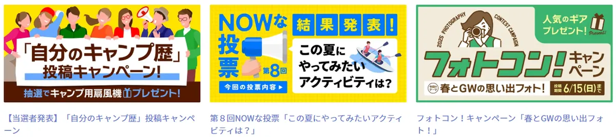 キャンプテーマのフォトコンテスト開催など、実施中のすべてのイベントを掲載しています。是非投稿やコメントをして皆さんで交流してください!