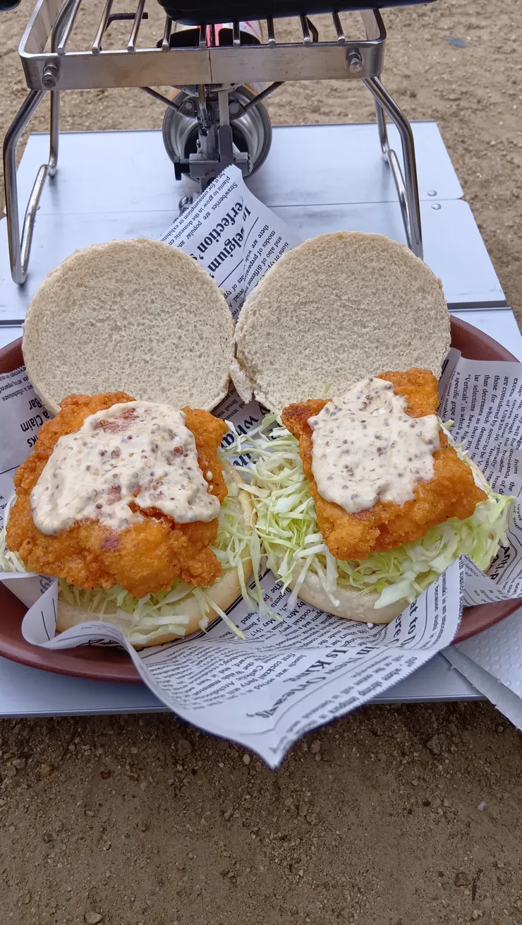 ドンチキをHSMで焼いて、キャベツと一緒にバンズに挟んで出来上がり。