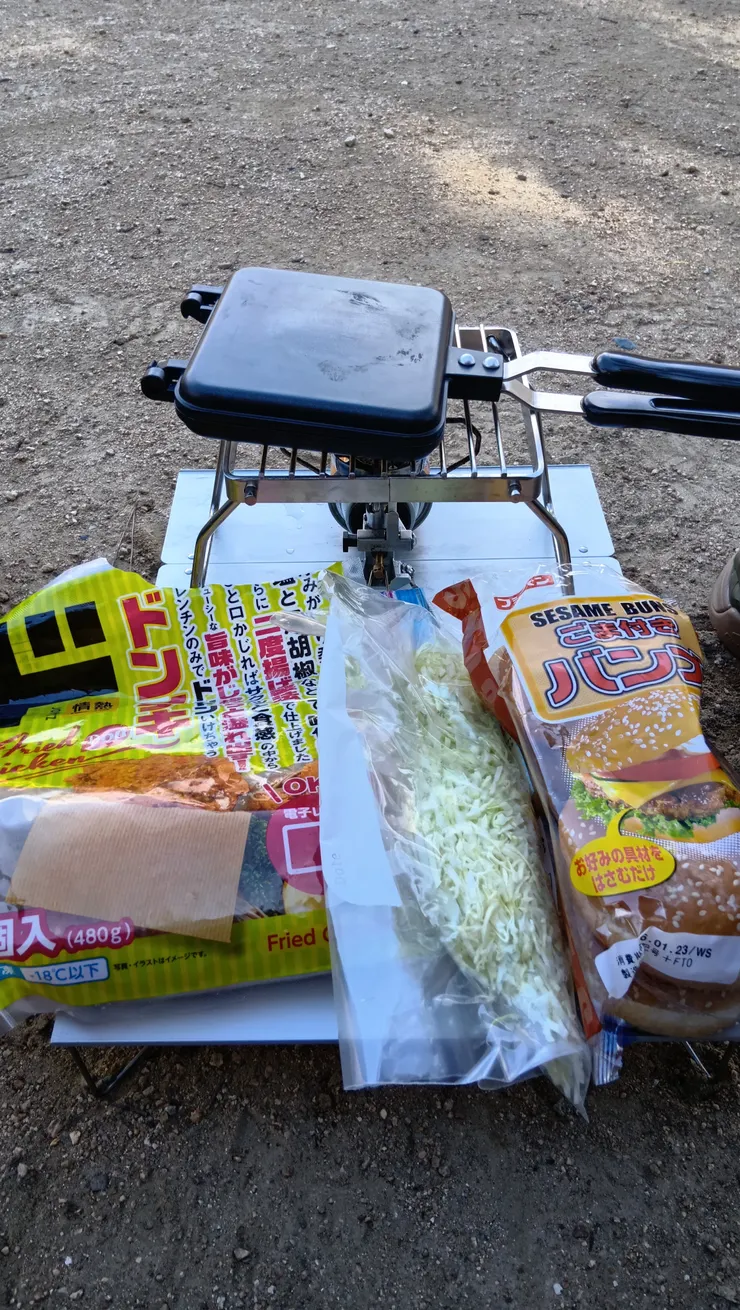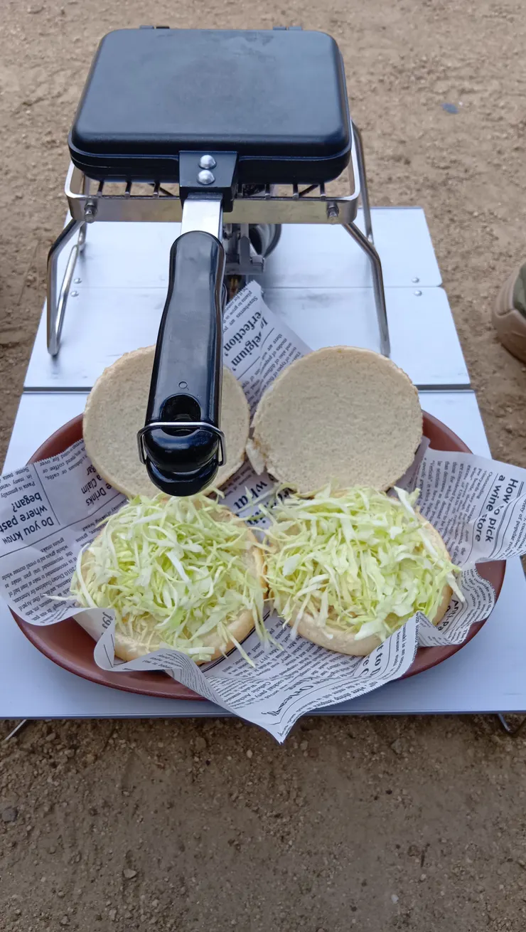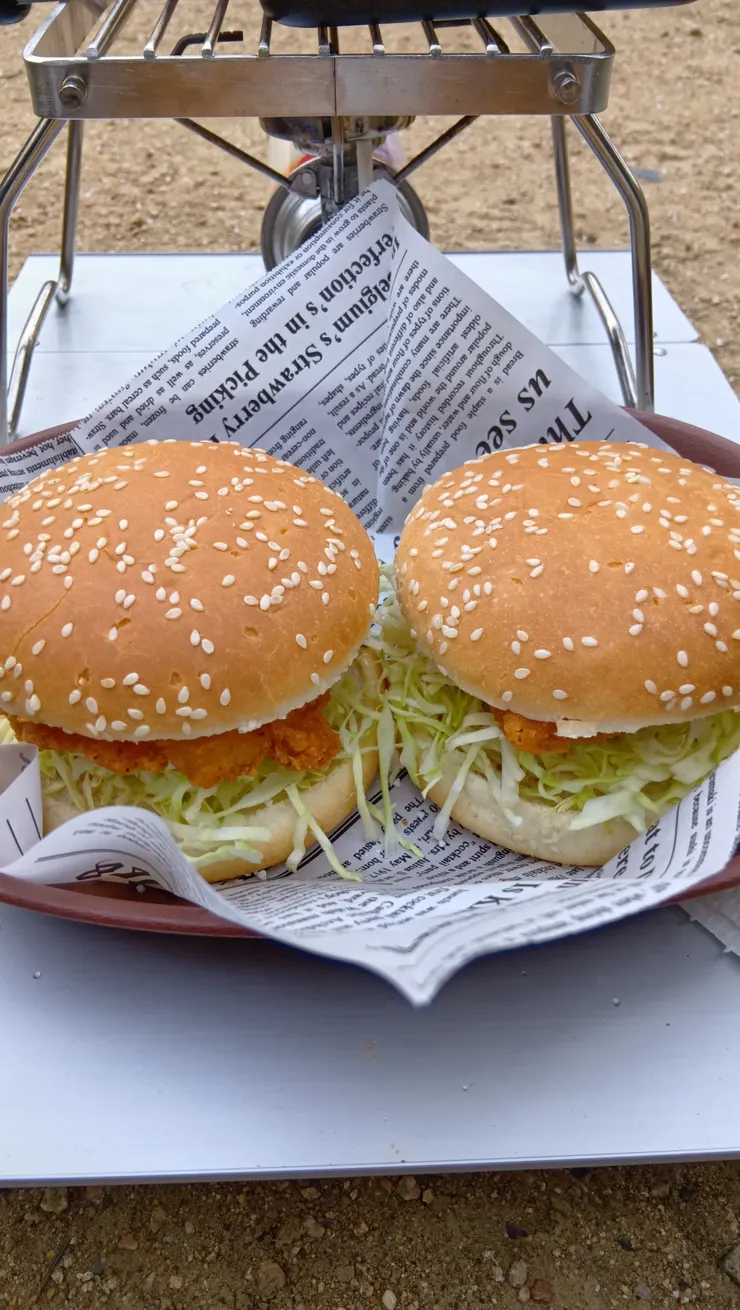 ドンチキをHSMで焼いて、キャベツと一緒にバンズに挟んで出来上がり。