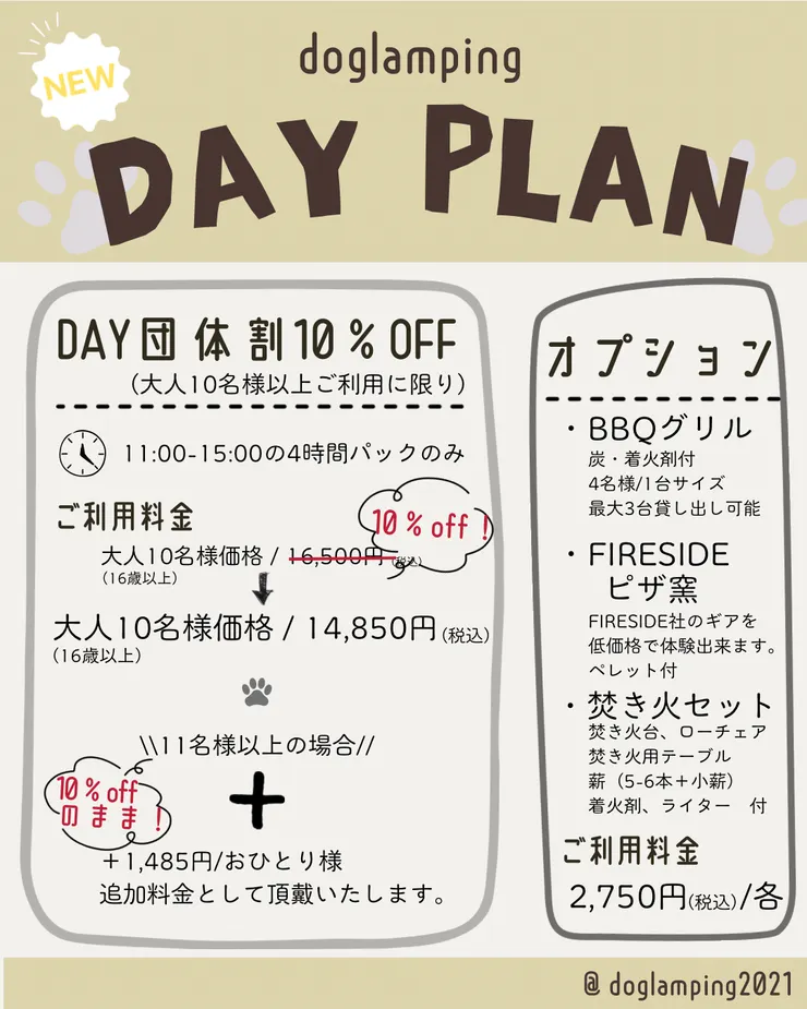 doglampingに、宿泊なしで楽しめる新しいDAYプランができました。