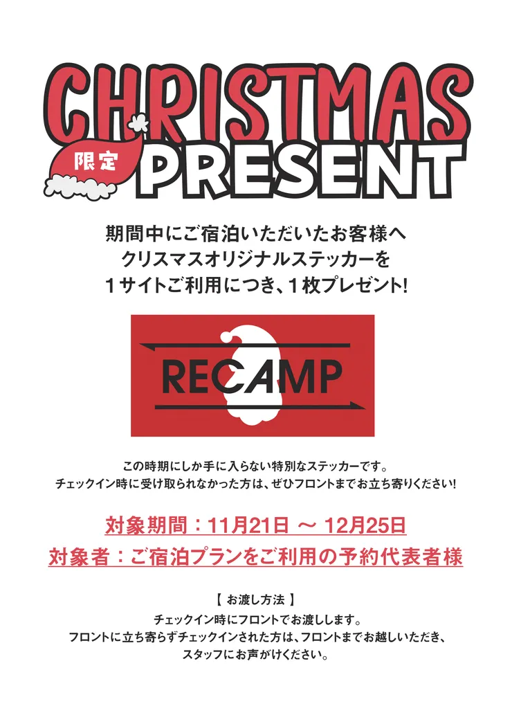 期間中にご宿泊いただいたお客様へ、クリスマスオリジナルステッカーをプレゼントします!