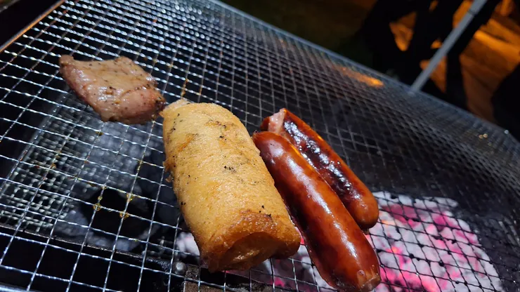 晩御飯はBBQ。仙台の牛タン屋「伊達のくら」さんからお取り寄せした極上牛タンと、地元かま栄のパンロール(かまぼこをパンで巻いたもの)、ジョンソンヴィルのウインナーを、炭火でいただきました。(写真④)