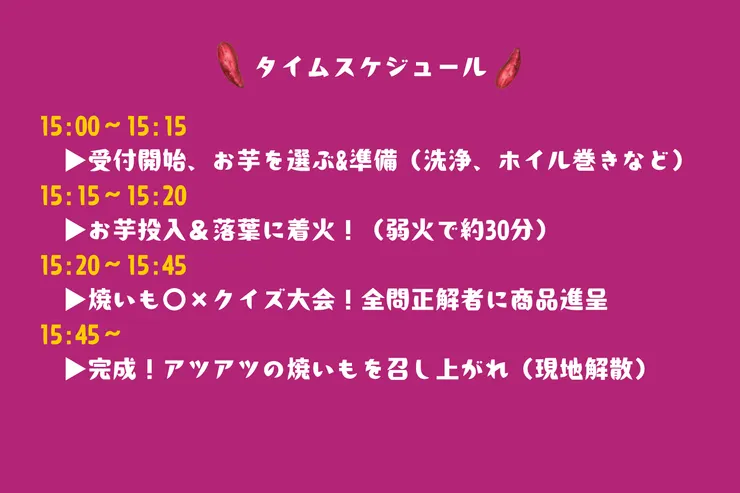 焼いている時間に、焼き芋の事がもっと好きになるクイズ大会も開催予定!