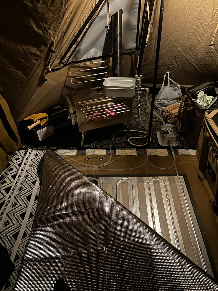 いろんなキャンプサイトを見てきましたが、温水床暖房作ってる方は始めてみました!