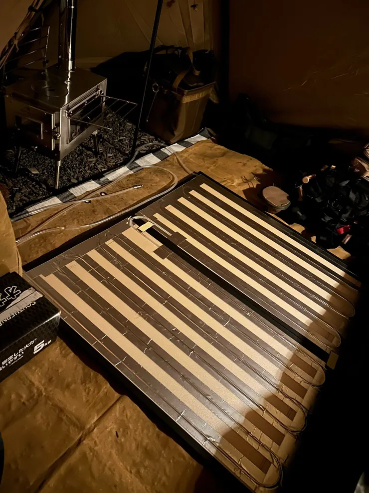 これなら高額なポタ電や電源付きサイトを必要とせずにテント内床暖房が実現する❗️😆