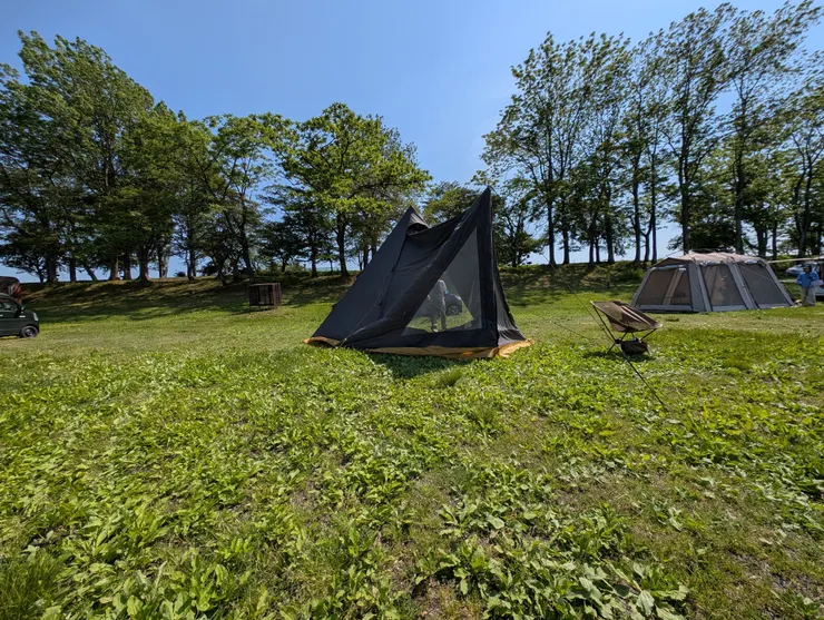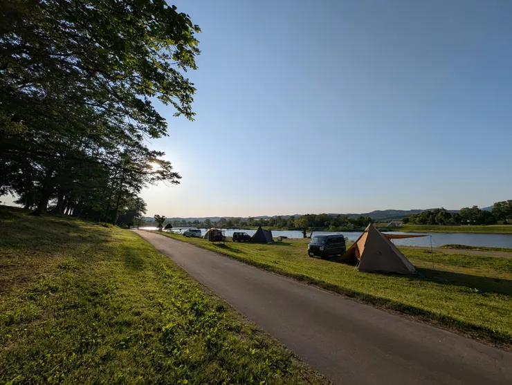 札幌から車で1時間程度にある月形町。皆楽公園沼を囲んで5カ所の区画がありました。1は管理棟に近くてごめんなさいほとんど見えない芝生。2は車横付けできてほぼ土サイトで湖面沿い。しかも湖面に夕陽が映える。3、4、5は半オートで傾斜がありそうな芝生。トイレが一番綺麗。