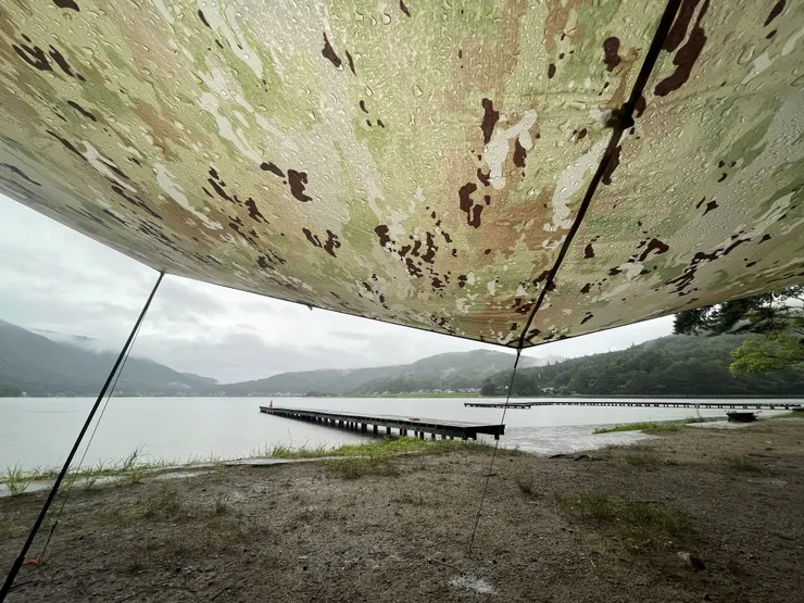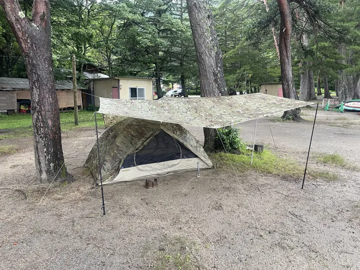 新品のタープを即雨キャンプにぶち込むスタイル。