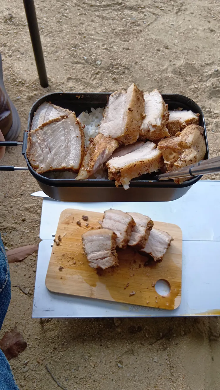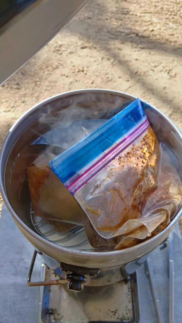 コカ・コーラ(赤)に一晩漬け込んだ豚バラブロックに、調味料を入れて飯盒へドボン。