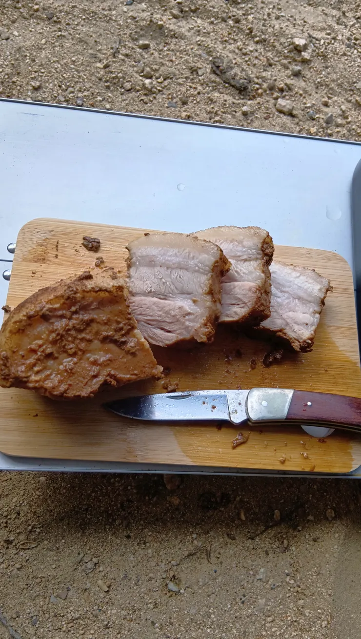 コカ・コーラ(赤)に一晩漬け込んだ豚バラブロックに、調味料を入れて飯盒へドボン。