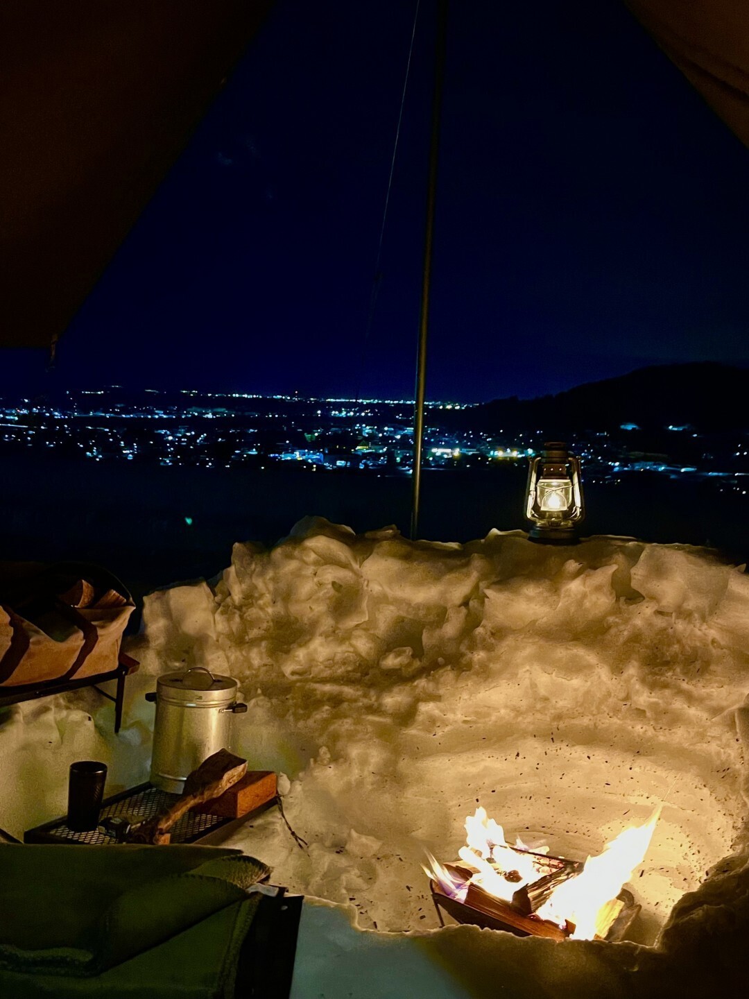 ライズ3131さんも雪中キャンプの投稿ですが、街明かりが一望できる絶景スポットでの焚き火写真が最高の構図のお写真です。