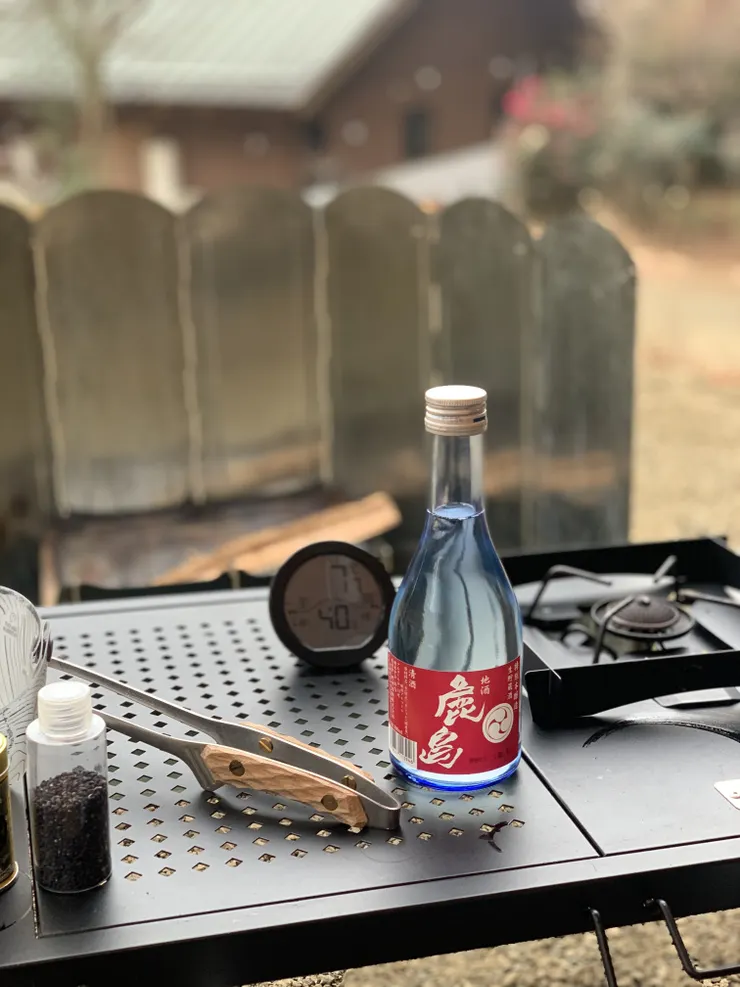 さてさて、、汗を流したら早めのくつろぎタイムへ。今回は、先週キャンプで鹿島神宮に寄った際に購入下日本酒🍶3種の中から、鹿島を持参。(息息栖と香取はまた、次回以降のお楽しみに)