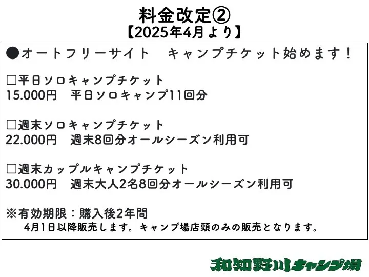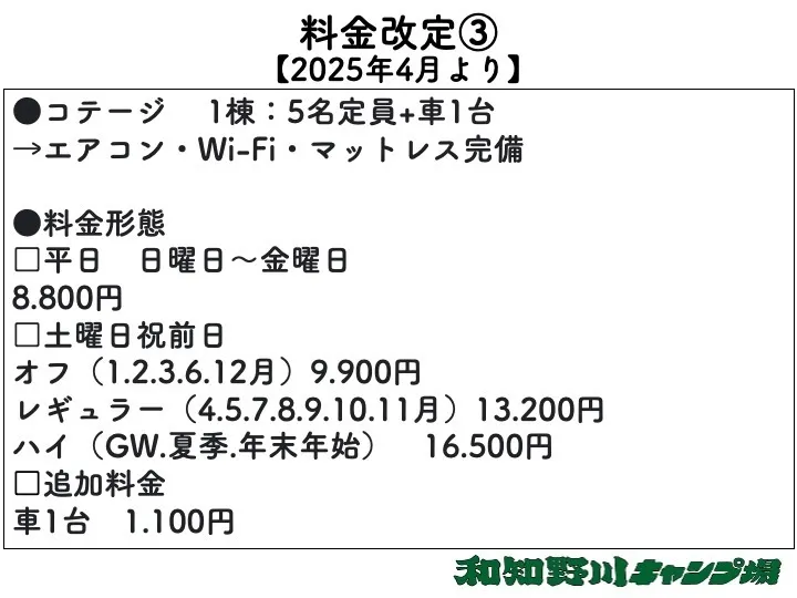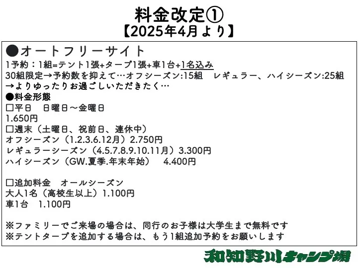 2025年4月1日より、和知野川キャンプ場の利用料金について改定させていただきます。