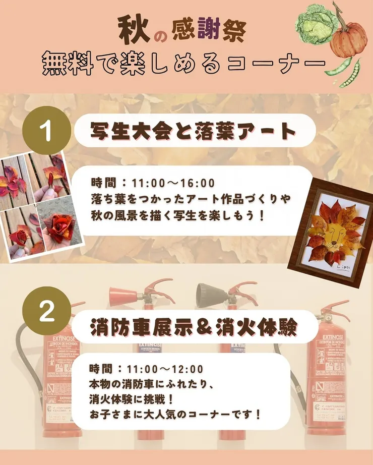 | 10:00~16:00 | 写生大会と落ち葉アート | クラフト室前テント | 無料 (画用紙1枚配布) | 当日受付 |