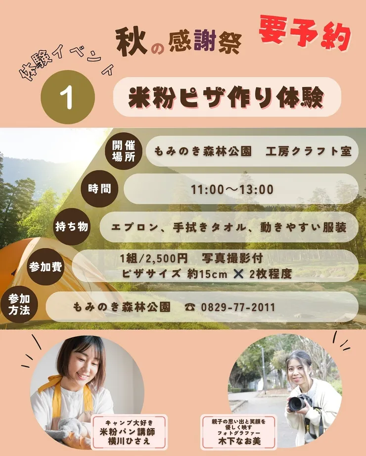 そんな大自然の中で、ご家族やお友達と特別な一日を過ごせる秋の体験イベントを11月2日(土)に開催します!人気の米粉ピザ作りをはじめ、体を動かすイベント、アート体験など盛りだくさん。ぜひチェックして、秋の思い出を作りにお越しください!