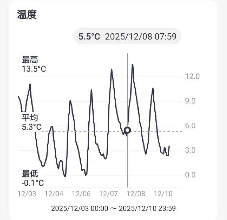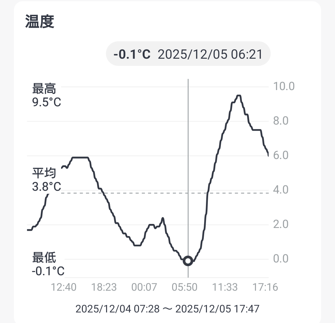 グラフとかを見ると6〜7時ぐらいが一番冷え込むみたいです。