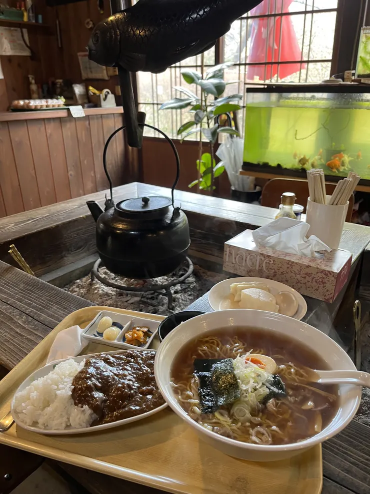 お昼は熊さんの村で囲炉裏を前にラーメンセット。あったまるなー