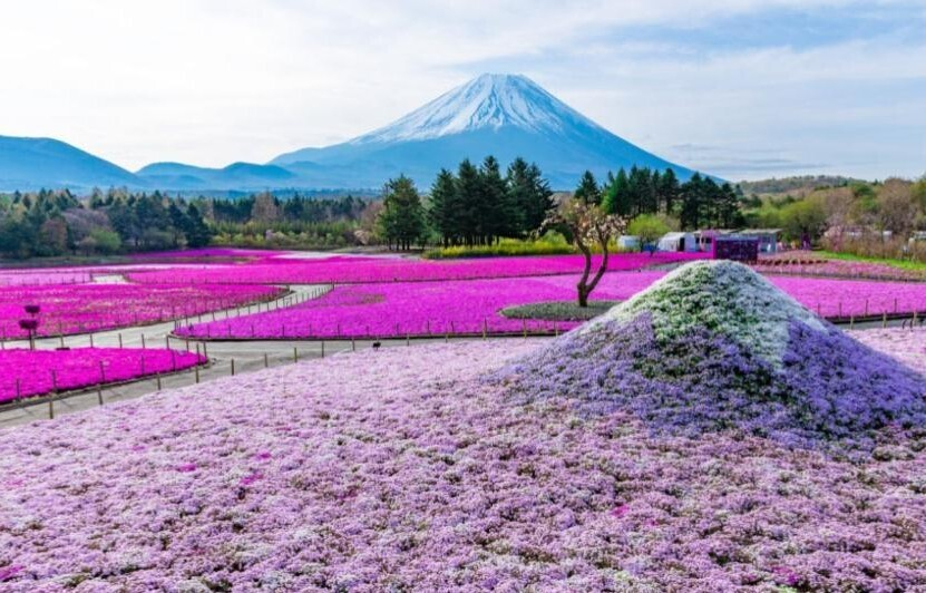 【圧倒的な「ピンクの絨毯」と富士山のコントラスト】