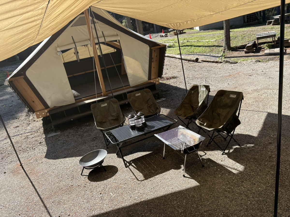 「よせぎテントキャビン」プランには、キャンプを満喫するための基本的なアイテムがプラン料金に含まれています! 屋外には4人用の常設タープが張られており、アウトドアテーブル(1台)とアウトドアチェア(4脚)で、快適に食事や語らいを楽しむことができます。