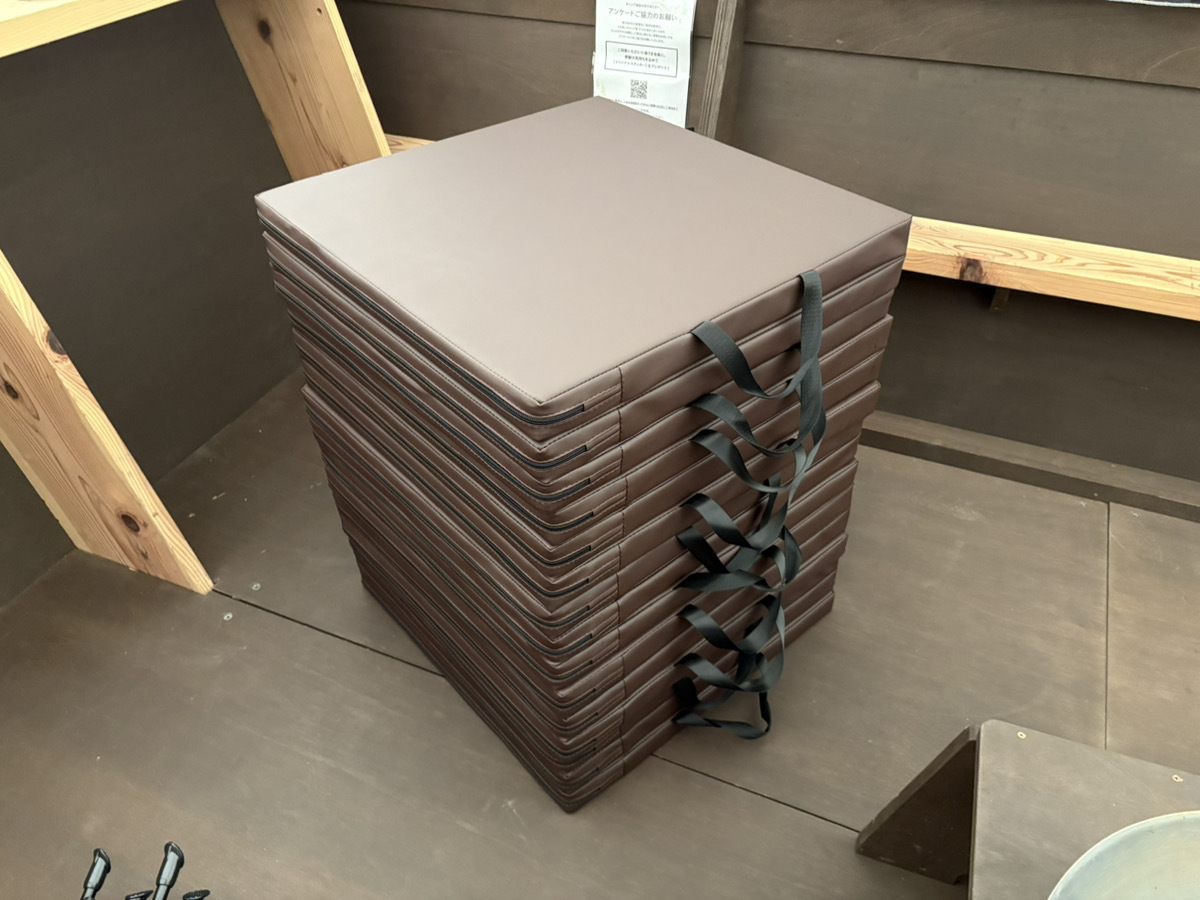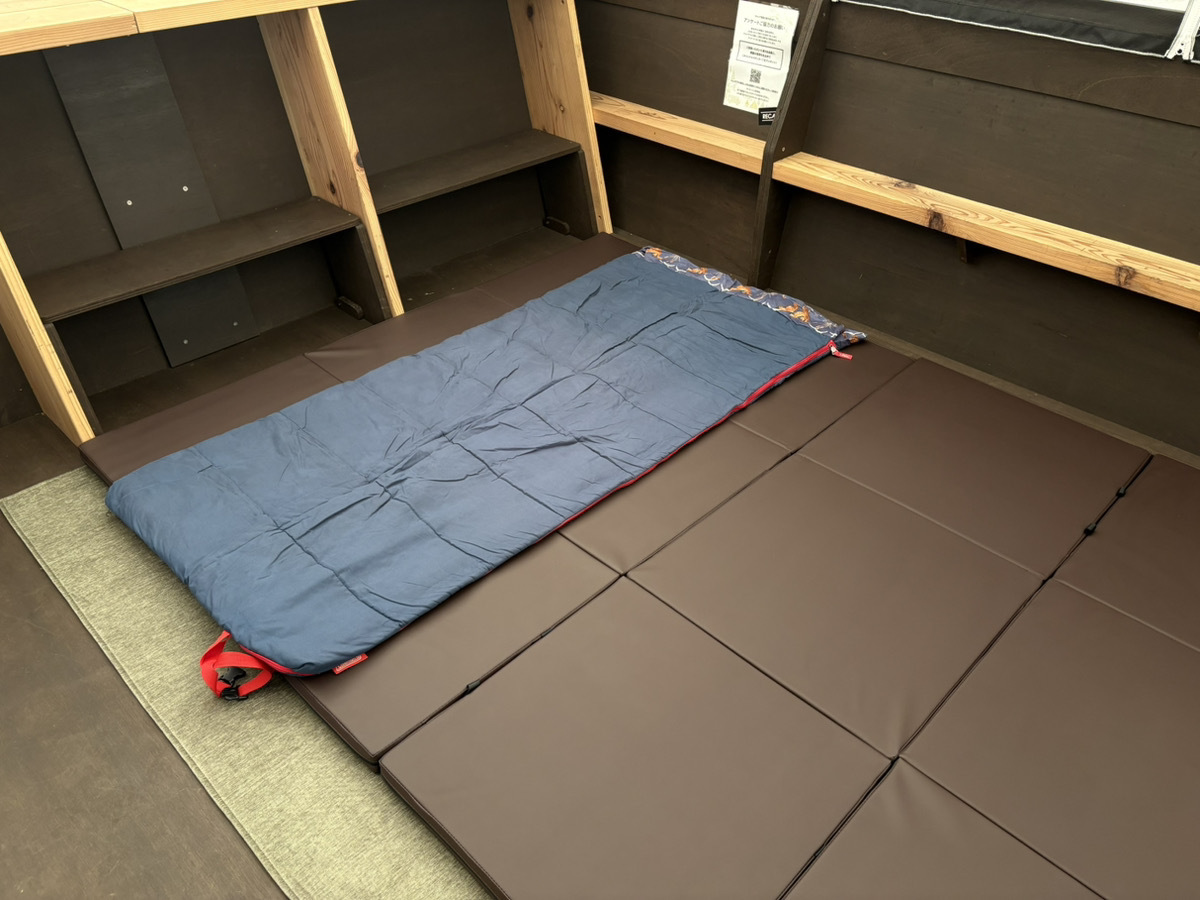 テントキャビン内でゆっくりおやすみいただけるよう、マット5枚と、人数分のシュラフをご用意しております(夏季はブランケットとなります)。