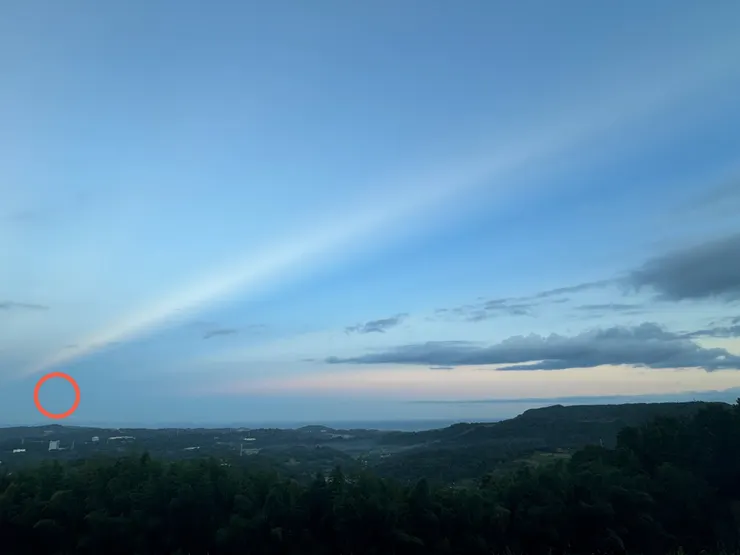 現在、山頂サイトから見える日の出の位置は、広角で撮った写真4枚目の赤まるの印のあたり、湘南平付近です。テレビ塔が目立つので比較的わかりやすいかと思います😊