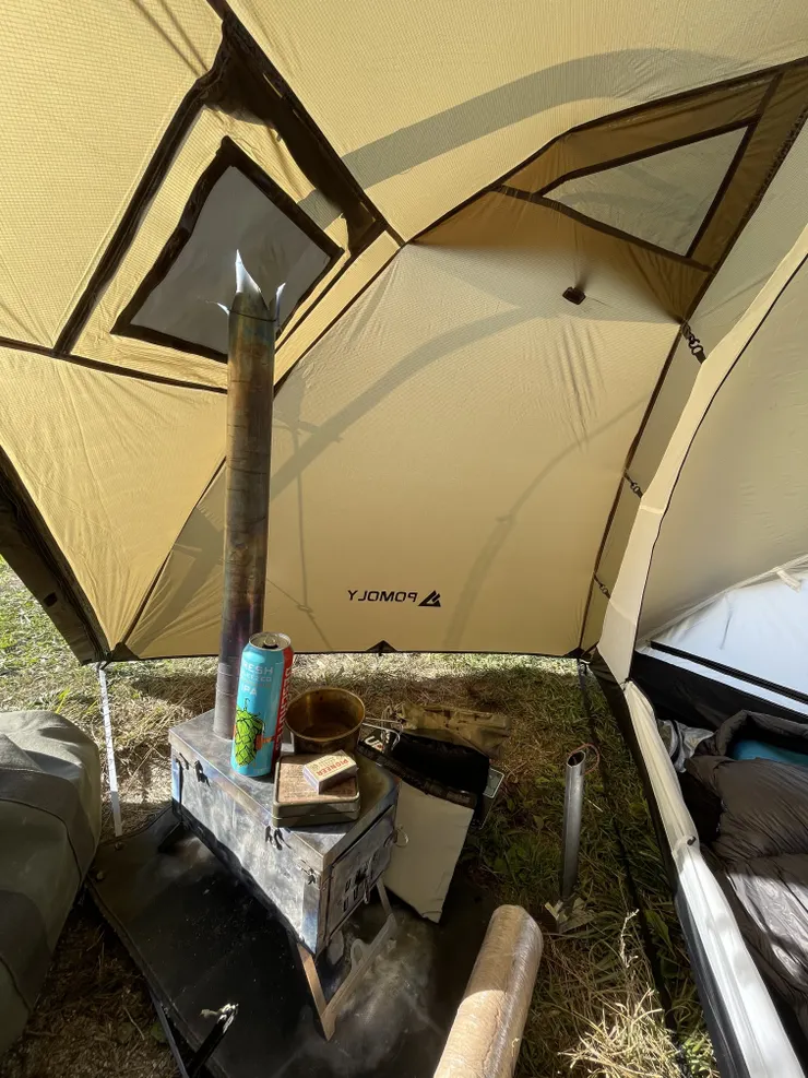 テントは前日に入荷の連絡が来たので長野市までダッシュし購入してきたPOMOLYのソロテント!初張りでポールの位置間違えるしあれれ?とかやりながら設営。ソロテントで薪ストーブが使えるの凄すぎぃ!同社のLEO2も良いテントでしたがこの子も良いテントでした!雰囲気的にLEO2は真冬で積雪多い時用。ソロは初冬と春前位のスタンスがちょうど良さそう!