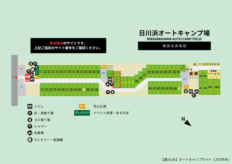 250㎡!広々キャンプ!シャワーや炊事場がすぐ隣!直火スペース有り!