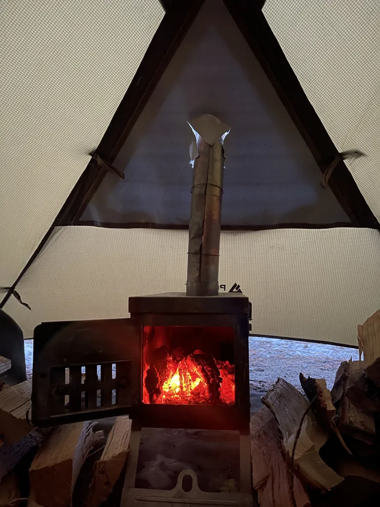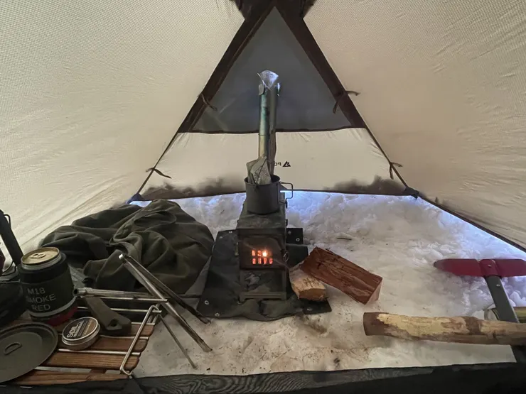熱量はソロ用テントなら充分なくらいに暖められる性能。薪投入口も広くて普通の薪ならスポッと入る。ただし奥行きは35cm位だから薪の切断が必要。