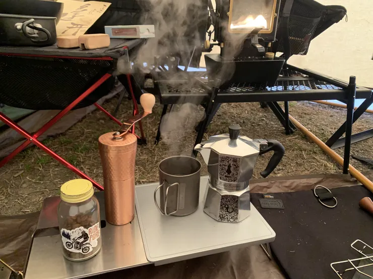 翌朝は、コーヒー豆を挽いて、いつもの様にテント内でゆっくりと。朝は周りも静かなので良い感じですね。