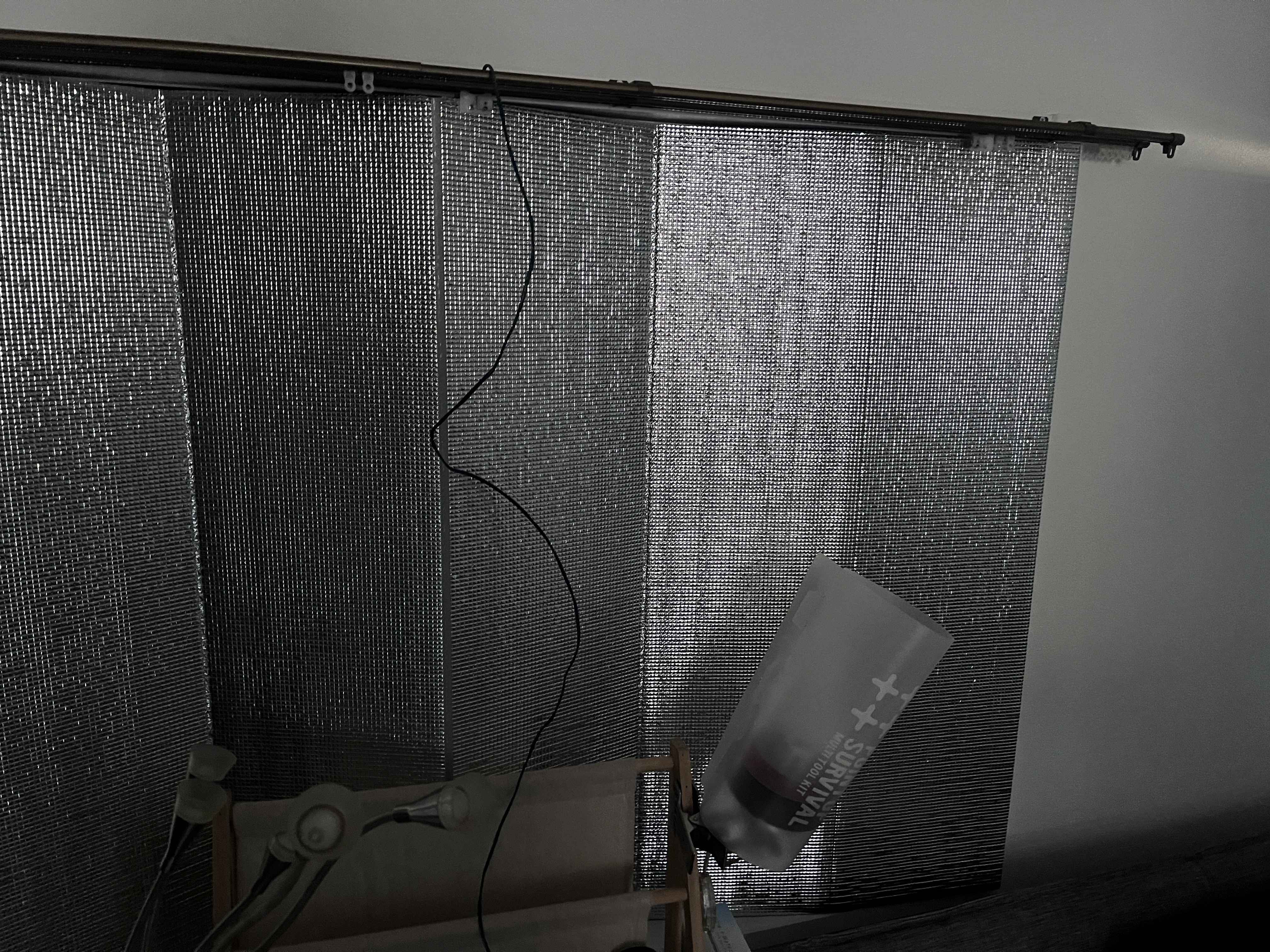 という条件に則り、屏風状にして立てかけるだけです。要部はカーテンレール/フックがうまいこと保持してくれて、見かけ上は自立します。