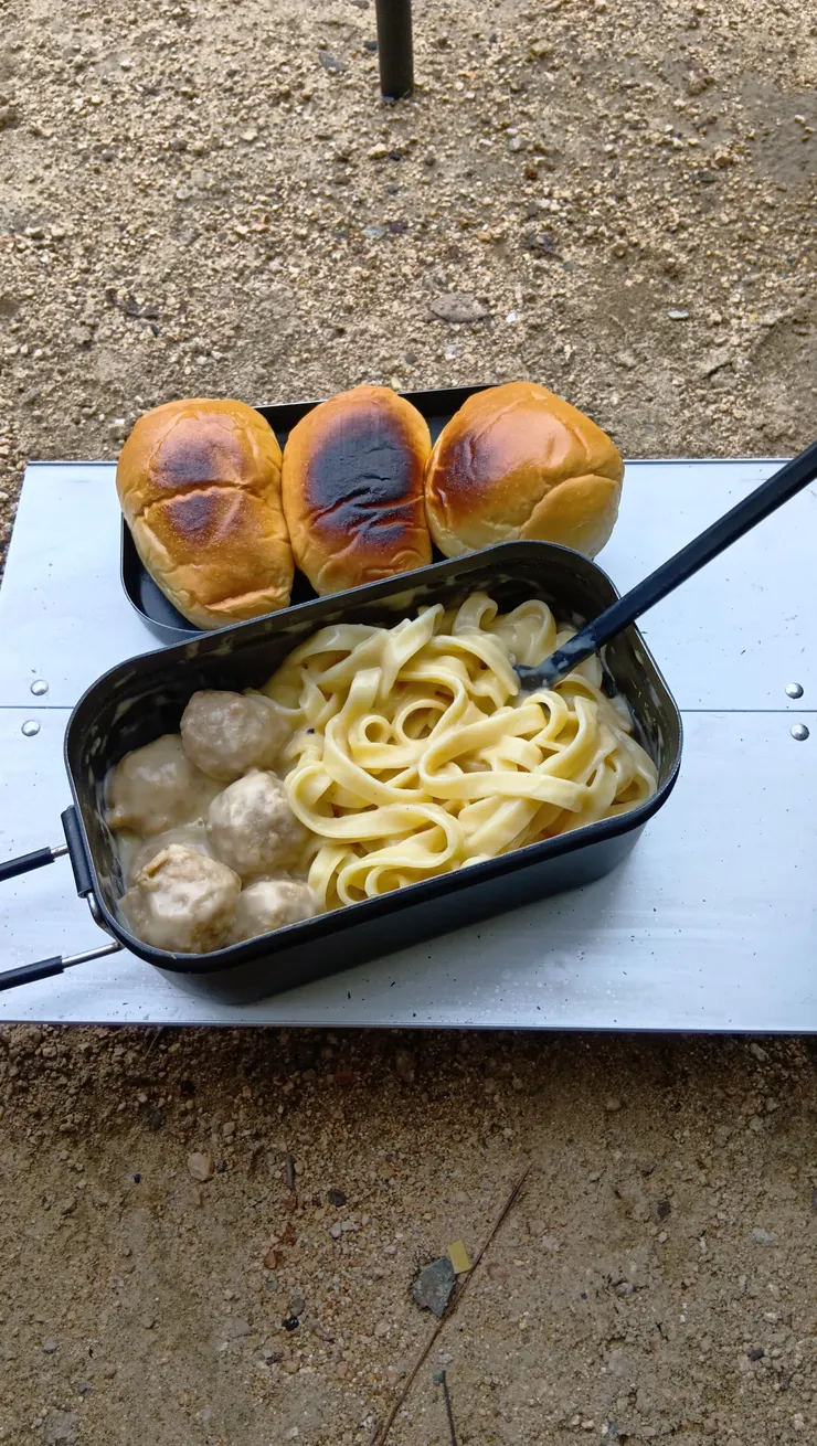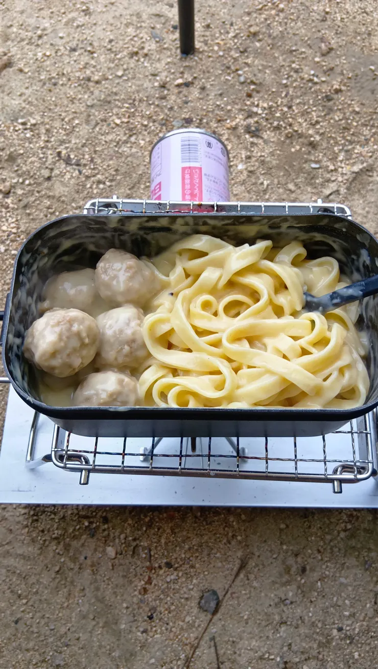 あとはミートボールごとパスタを茹でて、メスティンのフタで湯切りして、火にかけながらソースを和えるだけ。