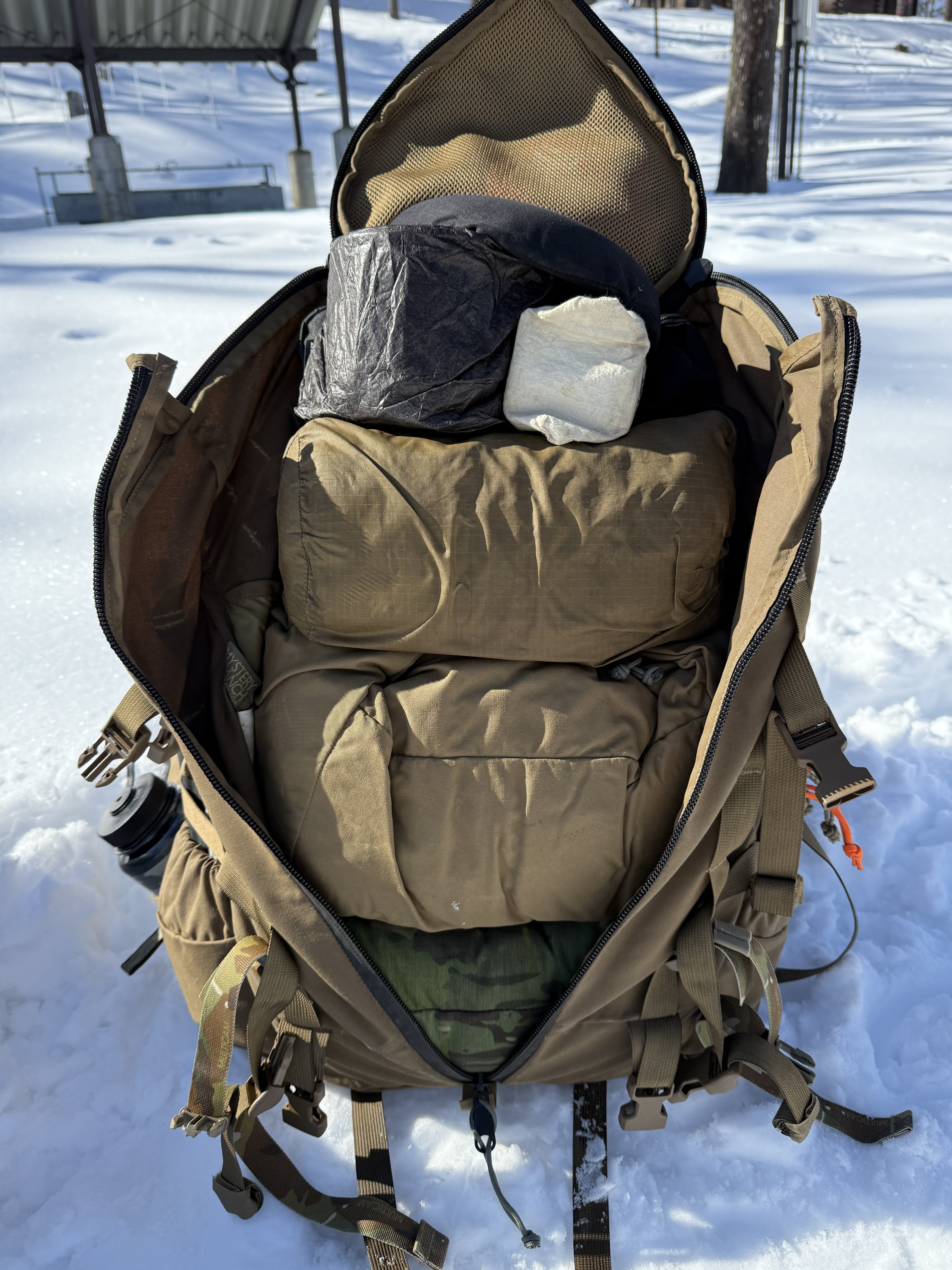 下の袋に寝袋と枕、真ん中はテント、上はマットと着替え、一番上にクッカーと電装系。背中側には薪ストーブとチェアを入れて外付けはペグとノコギリくらい。